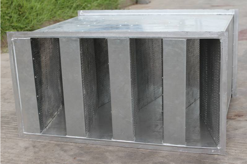 折板式消聲器是經(jīng)改良的一種片式阻性消聲器,吸音片呈折板狀,增加了聲波的反射次數(shù),使得消聲性能提高,該消聲器采用玻璃棉作吸音材料,鍍鋅穿孔板和超細玻璃棉布為護板,管道有效通道比較大,壓力損失小,是一種性能優(yōu)良的消聲器。除了把吸聲材料固定在氣流通道的內壁上以外,還要將阻性折板式吸聲原件按一定的方式均勻的排列在通道內,就構成了阻性折板式消聲器。為減小消聲器的阻力,折板消聲片迎氣流端部可設導流頭。當聲波進入阻性消音器時,一部分聲能在多孔材料的孔隙中摩擦而轉化成熱能消耗掉,使通過消音器的聲波減弱。但反復折射碰撞也加大了阻力損失。折板式消聲器消聲量為10-25dB(A)。